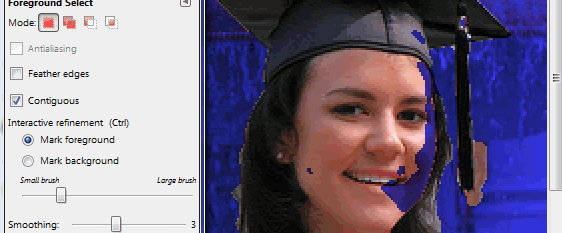 (4) Use the brush to paint her face a bit more. GIMP thinks part of her face is still background (it's in blue still). Then switch the tool to Mark Background and mark the part around her tassel which isn't blue.