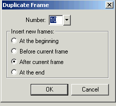 (6) From the pull down menu choose Duplicate Frame. Duplicate 10 frames after the current frame.