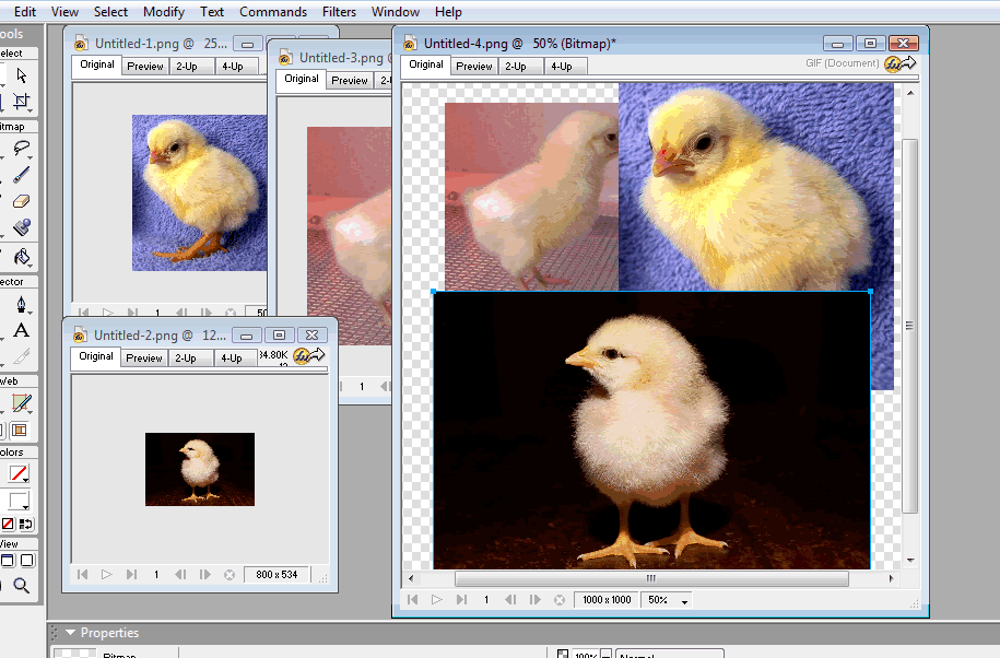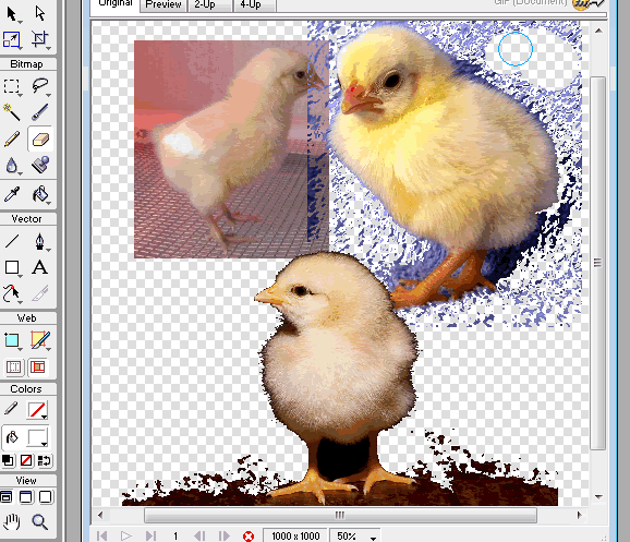 What we're going to do is to cut the pics OUT OF THEIR BACKGROUNDS and use our own background - solid or pattern. Fireworks, File, New, make your canvas about 1000w 1000h. Paste your three pictures. Save this with the name Collage.