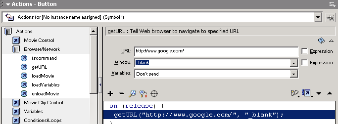 18. In the Actions Window click Actions>Browser/Networks. Double left click getURL and apply these settings on the three blank text boxes that appear:: URL: http://www.google.com/