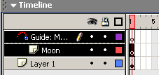 | 8.. Right click on the name label for the moon layer and left click on "motion guide". What looks like a new layer will become visible on the time line. This is the layer in which we will draw our motion guide. | ![]() |