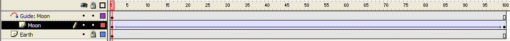 | 13. You will need to place a regular frame (not a keyframe) in frame 100 of the the Guide:Moon layer in order to make the motion guide elipse visible in frame 100. | |