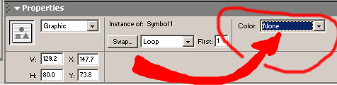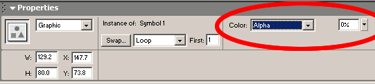 7. Select Layer 1, frame 30 and look at the Properties window - Find Color:None and change to Color:Alpha "0"