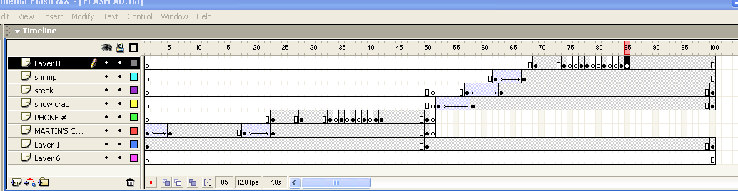 This is a screenshot of the timeline from my Ad. You can see that the bottom layer (Layer 6) should have been deleted, it's empty. Layer 1 is the picture of the crab that is the background. The next layer is the one with two tweens, the first tween makes the words slide onto the screen, the second makes them shrink into the corner. The layer above is the phone number, then blinking phone number. |