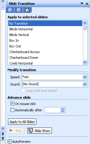 By default, PowerPoint slides have No Transition. Click one to see what it looks like. |