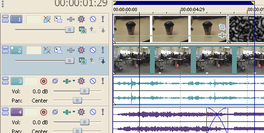 Video track 1 is where I videotaped the coffee cup and masked out the background (the table). Then I set the event velocity to zero, since I taped it without tripod and it was a bit jiggly. At the end of the coffee cup I added a generated media and keyframed it to make it move. Video track 2 is where I taped the classroom using tripod. Audio track 3 is classroom audio from video camera. Audio track 4 is sound effects. |