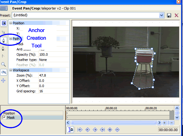 (5) Select the middle track and we'll create a mask around the person on the right. Check the mask button. Select the Anchor Creation Tool. Set points all around around the subject on the left (cooler on stool in this example).