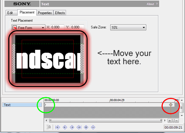 While the first keyframe is selected (the one in green) move your text offscreen to one side. Then double-click at the end of your timeline (where red is circled) and you will have created another keyframe. Drag the text offscreen to the other side.