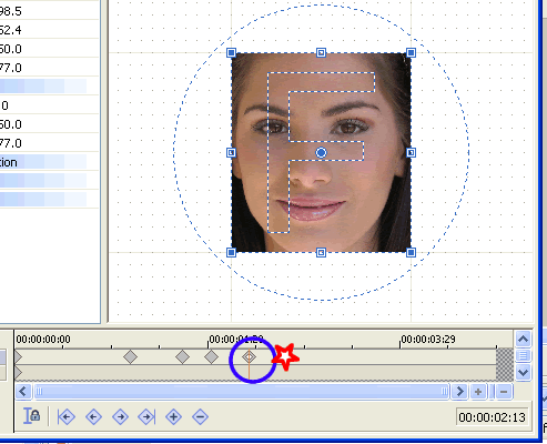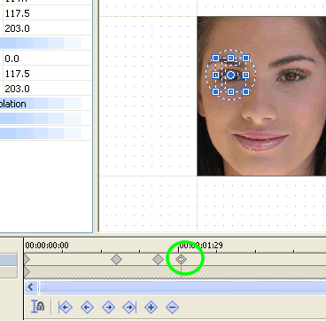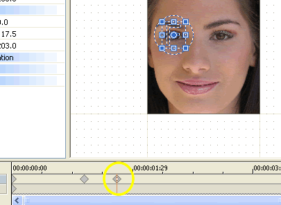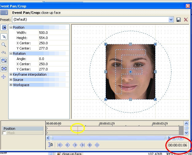 | Before we start zooming, let's hold the full face for a second. Put a keyframe where indicated by the yellow circle.....note that the time at that point is 01:06 (one second, 6 frames). | ![]() |