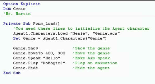 | To see what the agents can do, see the animation lists: | Option Explicit Dim Genie Private Sub Command1_Click() Private Sub Form_Load() |