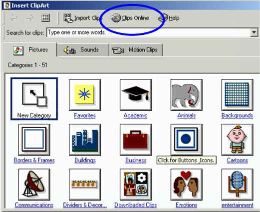 Unfortunately, on many of the computers in here, you can see many pictures in a category, but most are unavailable. To get around this, choose Clips Online (circled in blue). |