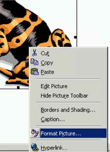 | In Word, you should see your Clip. Click on it once so that you have a black box with small black squares around it. You can use the corner squares to resize your clipart. Use the corners to resize or you might change the look of your picture. | You'll probably notice that you can't really move your Clip. We'll need to change the wrapping. Right-click on the clip and choose Format Picture. |