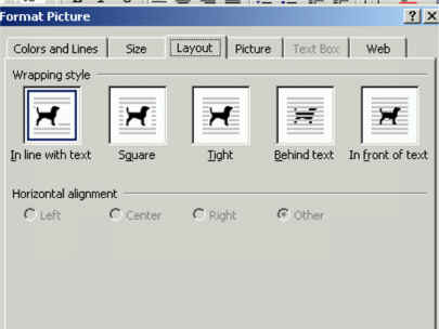 | Choose the Layout Tab. | Usually ClipArt will start with "In line with text" which means that your clip will be inline with the letters you type from the keyboard. A common wrapping for text documents is Square. |
