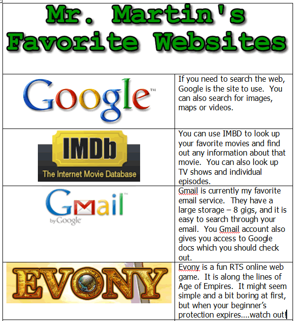 Favorite Websites PageIn this document you will select 5 of your favorite websites and create a favorites link page. (1) Start a new Google Doc. (2) Make a two column table. Six rows. (3) Merge the two cells in the top row. This is where you'll put your text heading. Make a nice text heading using Photopea or http://cooltext.com Each row will be about one of your favorite websites. Two columns and two pieces of information