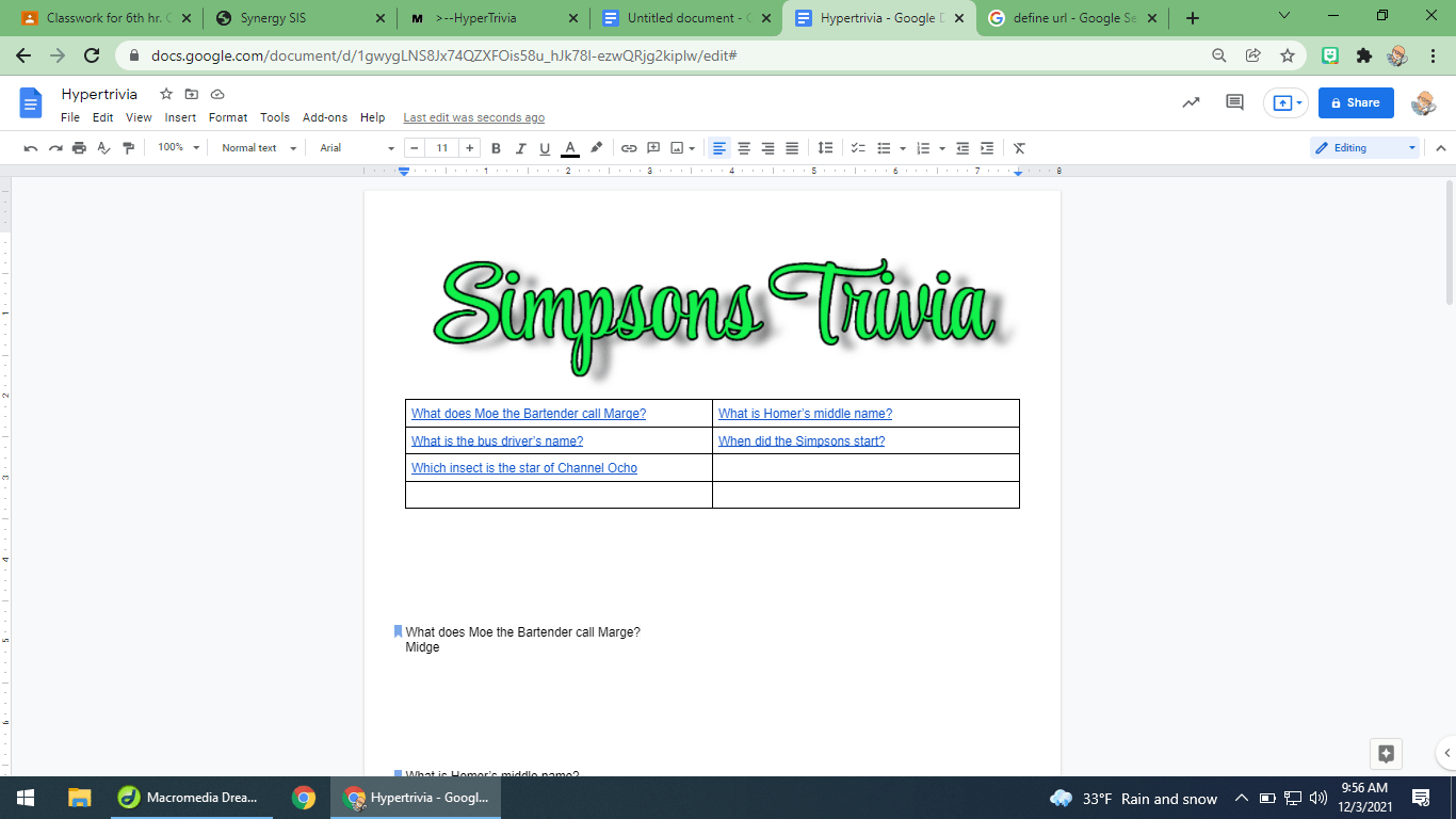 (2) Type your trivia questions in a table (don't type the answers yet)