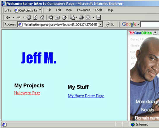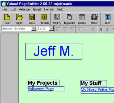 You must have your name at the top. First name &b last initial only. You must list our class projects that I specify under My Projects on the left. List Halloween Page as your first project. Note: The blue outlines around the textboxes won't show online. If you want to design a page of your own, list it in a category "My Stuff" Note: Your hyperlinks will not work while you're in PageBuilder. |
