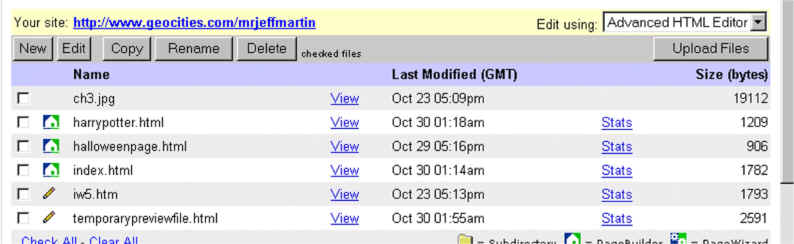 You can Edit, Rename or Delete your web files here. If you want to add your own files to your web site, you will use the File Manager to transfer them over to Geocities.