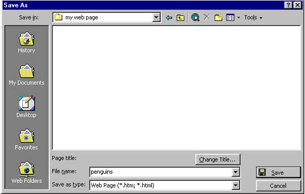 There are three things to consider. Save in: should read your "my web page" folder File name: no caps or spaces---keep file names simple Save as type: Web Page